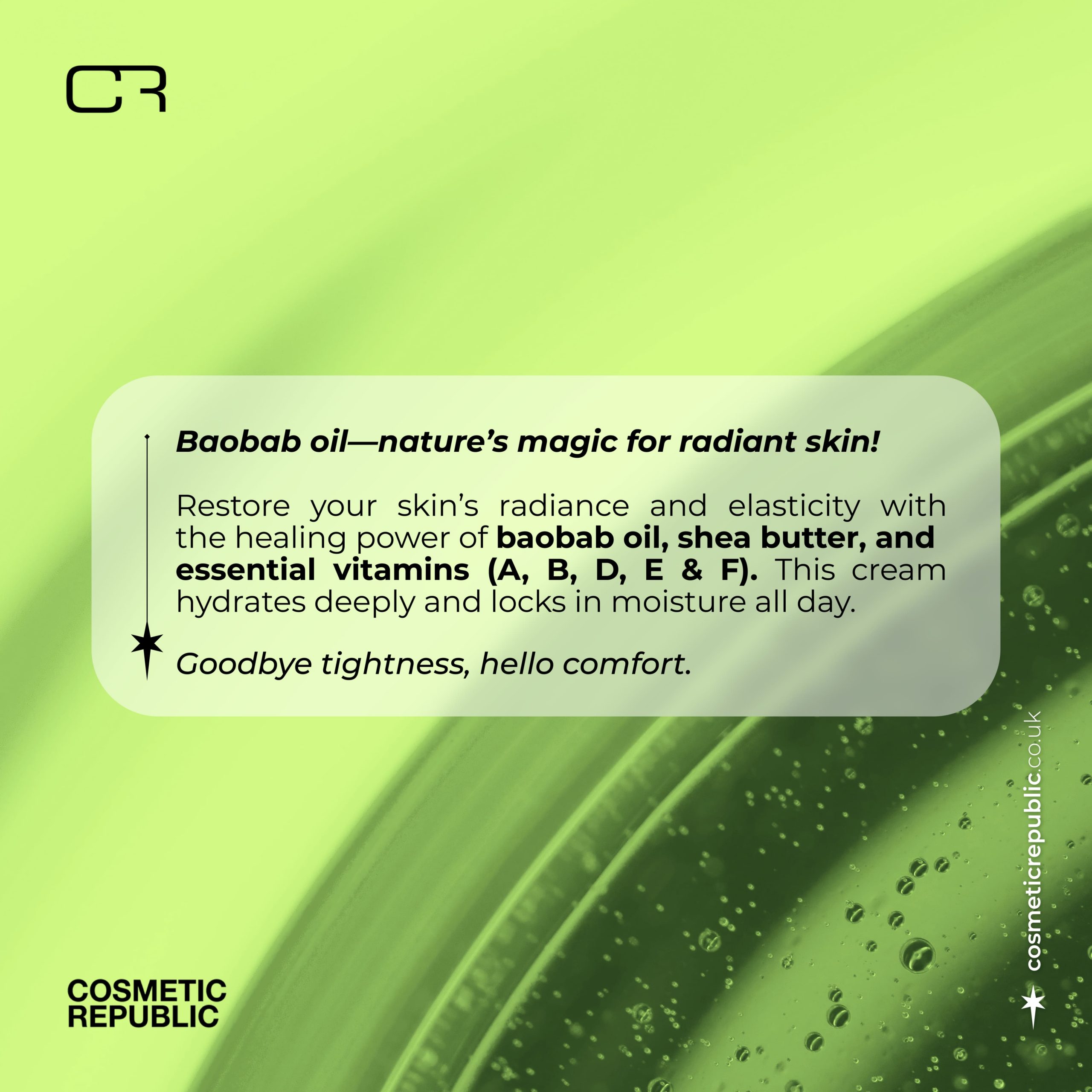 This cream consists mainly of Baobab oil, a rich and nutritious oil with a high concentration of fatty acids, vitamins (A, B, D, E and F) and Shea butter that combine to immediately super-hydrate and nourish the skin.
