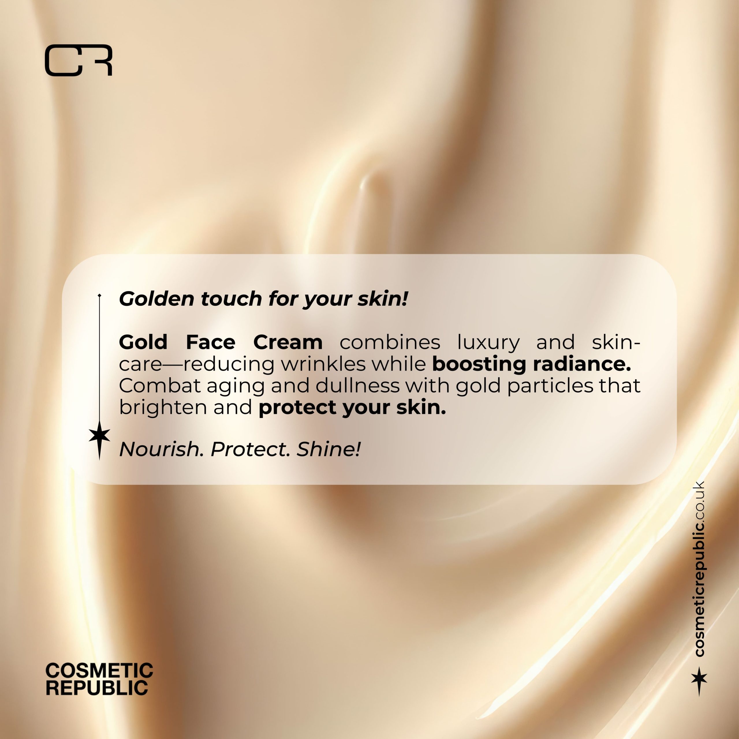 Experience the luxurious Gold Face Cream, a moisturizing facial cream that imparts a noticeable gold-like radiance to your skin. This unique cream draws inspiration from the wisdom of traditional Chinese medicine, harnessing the power of pure, alloy-free gold to provide a wealth of benefits and therapeutic properties. The pure gold within this cosmetic formulation works to powerfully regenerate and stimulate your skin cells, effectively combating harmful free radicals and delivering a potent antioxidant effect. Additionally, the minuscule gold particles create a captivating, radiant glow on your skin, enhancing its natural beauty like never before.